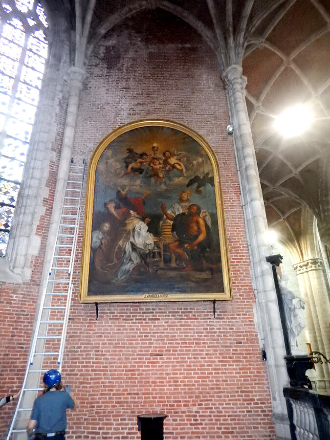 Demo-inspectie van de interieurwerking van Monumentenwacht in een van de zijkapellen van de Sint-Michielskerk. De monumentenwachters controleren of er houtborende insecten aanwezig zijn in de houten beelden en of er verf loskomt op de schilderijen. Daarnaast zijn ook de glasraamspecialisten van Atelier Mestdagh aanwezig om deskundige uitleg te geven. In samenwerking met Stad Gent.